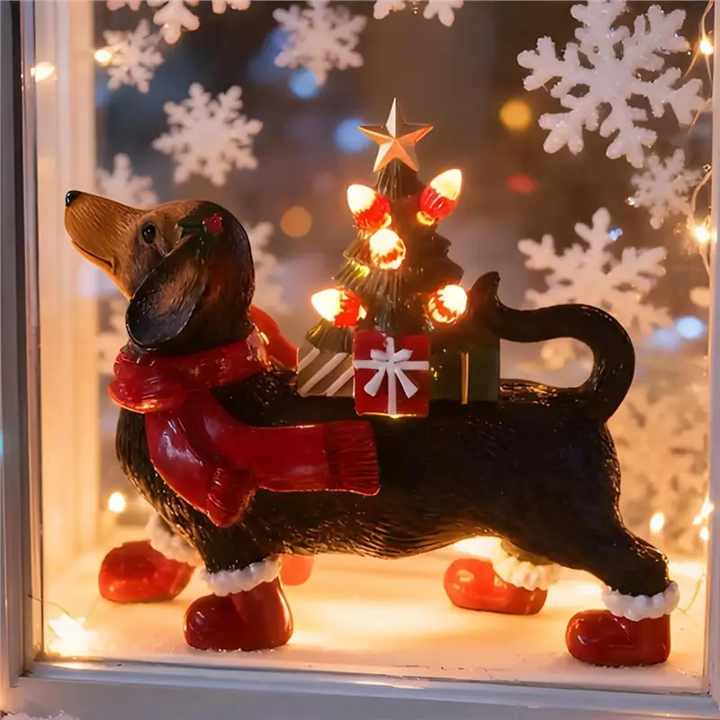 ABKS-Cute Lighted Dachshund Figurines Dog Christmas Decor For Desk Table Shelf Home Bedroom Room Small Sculptures